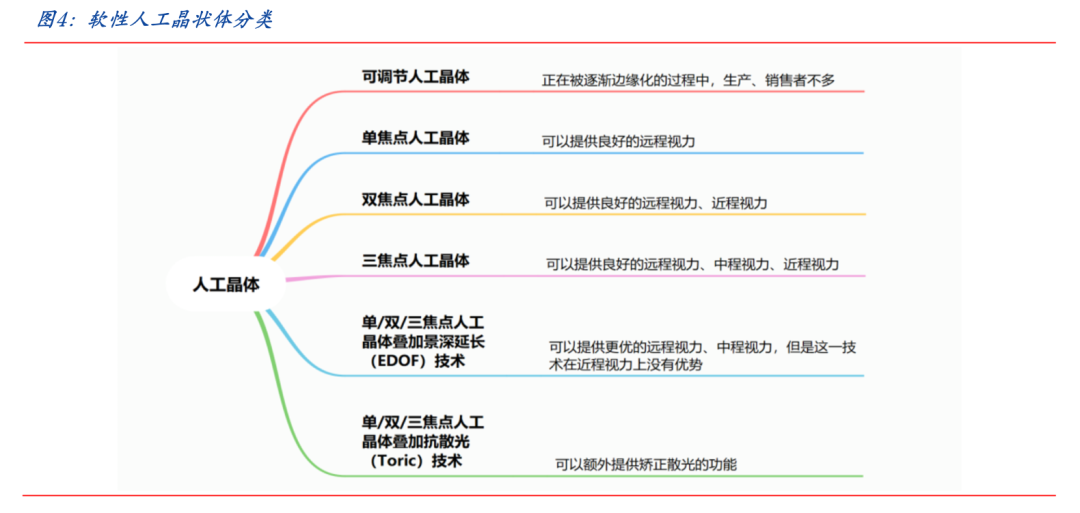软性人工晶状体具有众多细分领域。软性人工晶状体细分领域包括可调节人工晶状体、单焦点人工晶状体、双焦点人工晶状体、三焦点人工晶状体、人工晶状体叠加景深延长(EDOF,即ExtendDepthofField)技术、人工晶状体叠加抗散光(Toric)技术等。其中,三焦点人工晶状体价格较高,附加抗散光功能的三焦点人工晶状体价格更高。